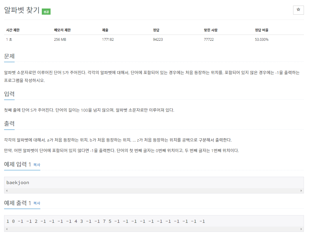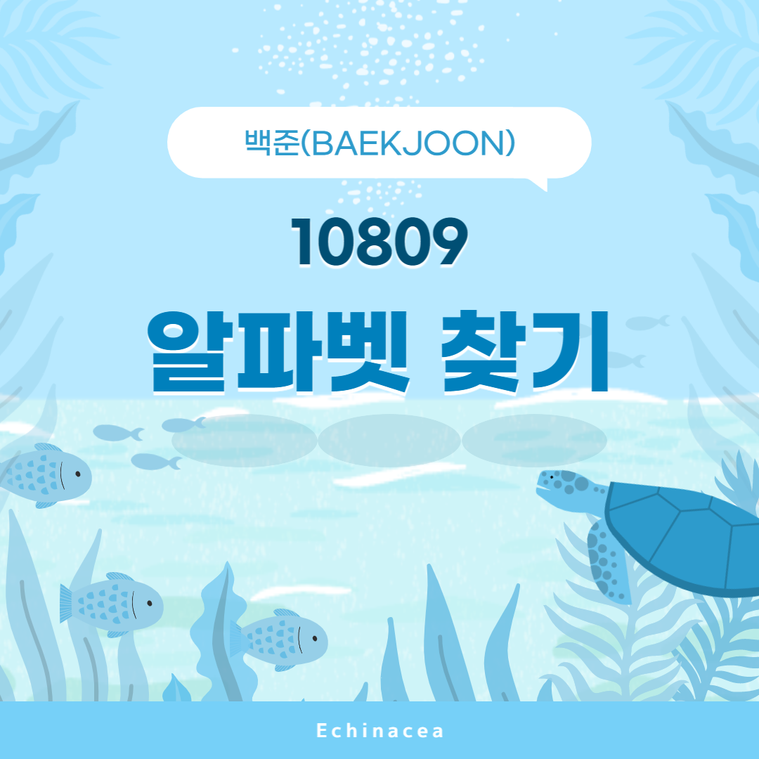 alphabet = list(range(97, 123)) #정수 변환 전 print(alphabet) #정수 변환 후 for i in alphabet: print(chr(i), end=' ') ----------------------------------console------------------------------------ [97, 98, 99, 100, 101, 102, 103, 104, 105, 106, 107, 108, 109, 110, 111, 112, 113, 114, 115, 116, 117, 118, 119, 120, 121, 122] a b c d e f g h i j k l m n o p q r s t u v w x y z마지막으로 alphabet 리스트에서 입력받은 값을 찾아주는 find 함수를 이용하기만 해도 문제의 출력값이 바로 나온다.