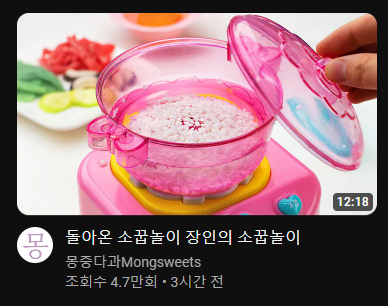 - 이 채널에서 가장 핫했던 동영상은 ‘소꿉놀이 장인의 소꿉놀이(https://www.youtube.com/watch?v=9-Qdn-E-p2k) 영상이다. 조회수만 1042만회.